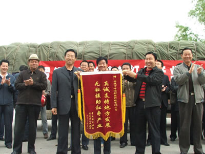 2006-05-25罗钾公司赠送钾肥100吨支持红枣产业5月9日,新疆若羌县人民政府领导干部(右1)正送一面锦旗给罗钾公司,感谢罗钾公司对该县红枣产业的支持。 近年来,在若羌县发展红枣产业的过程中,罗钾公司给予了大力的支持。该县红枣产业已全面转入以修剪、嫁接、施肥等为主的管理阶段,罗钾公司支援红枣产业和加快塔东重镇建设为该县无偿赠送钾肥100吨。 [详细]