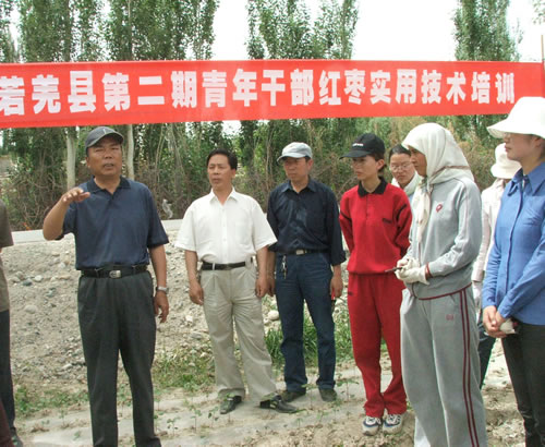 2006-05-26若羌县开展青年干部现场红枣实用技术培训5月25日,新疆若羌县委书记张亚平(左一)正在铁干里克乡考干村红枣地里为青年干部们现场讲枣树夏季修剪和夏季管理。 近日来,新疆若羌县举办了第二期青年干部培训班,对40多名青年干部进行了“三个代表”重要思想及党性教育;新疆地方史、马克思主义宗教观、党的民族理论;红枣管理科技知识;市场经济、法律和国防教育;“三基本”、“五个当代”等内容的一系列培训,提…[详细]