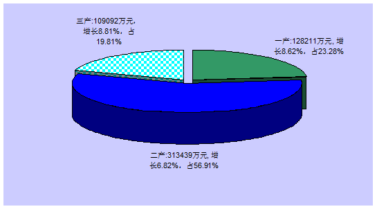 2017年,全县预计实现生产总值(GDP)550742万元,同比增长7.5%,其中:第一产业增加值128211万元,同比增长8.62%;第二产业增加值313439万元,同比增长6.82%;第三产业增加值109092万元,同比增长8.81%。三次产业比重23.28:56.91:19.81,第一产业较上年同期回落11.87个百分点,第二产业较上年同期提高9.21个百分点,第三产业较上年同期提高2.66个百分点。