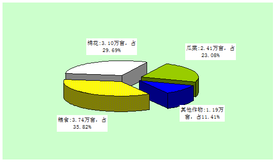 2017年,全县农作物种植面积10.44万亩,比上年增加1.06万亩,增长11.30%,其中:粮食种植面积3.74万亩,比上年增加0.96万亩,增长34.53%;棉花种植面积3.10万亩,比上年增加0.94万亩,增长43.52%;瓜菜种植面积2.41万亩,比上年减少0.75万亩,下降23.73%;其他作物种植面积1.19万亩,比上年减少0.09万亩,下降7.03%。