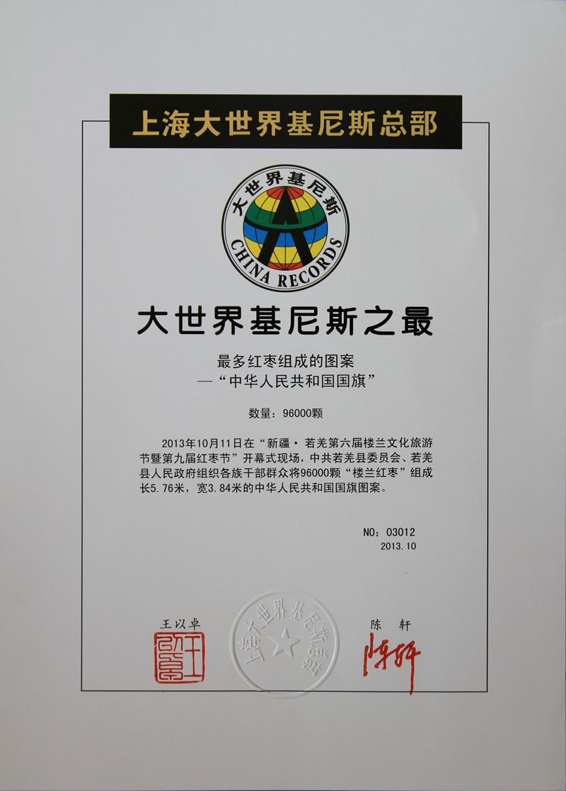 2013年10月,若羌县申报由最多若羌红枣组成的红枣国旗图案成功申报上海大世界基尼斯,国旗总面积22.1平方米,寓意为若羌22.1万亩红枣总面积。