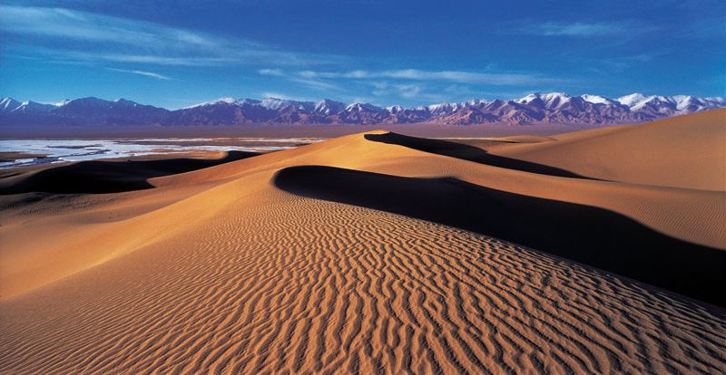 ——库木库里沙漠。库木库里沙漠面积达1600平方公里,横卧在若羌县祁曼塔格山与库如克皮提勒克塔格山—求拉克塔格山之间,海拔高度在3900—4700米之间,由高大的金字塔沙丘、复合型新月形沙丘和新月形沙丘链组合而成,拥有世界上沙漠海拔最高的沙丘—新月形沙丘。