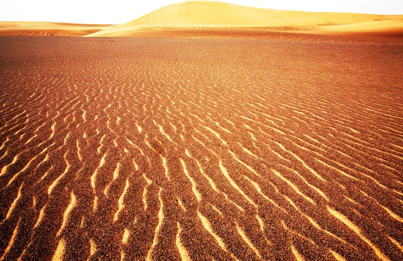 —库姆塔格沙漠。位于若羌县东部的库姆塔格沙漠,面积约2.2万平方公里。因世界上独一无二的羽毛状沙丘而被称为最美丽的沙漠。