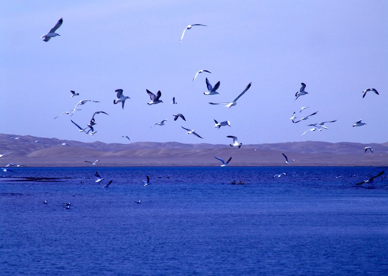 鲸鱼湖位于若羌县东南部的昆仑山腹地,面积260平方公里,湖面海拔高达4708米。湖水与雪山冰峰相互辉映,湖的形状恰似一条横卧着的肥大鲸鱼,头东尾西,故而得名“鲸鱼湖”。东半湖因有玉浪河补给,湖水咸度较低,西半湖因无淡水补给,蒸发强烈,湖水含盐量几乎达到饱和状态,是一个没有生命的死湖。由于两湖水质差异明显,自然形成东湖“鸥歌鸭舞”、西湖“万马齐喑”的鲜明对比,因此,人们又把鲸鱼湖叫做“阴阳湖”。