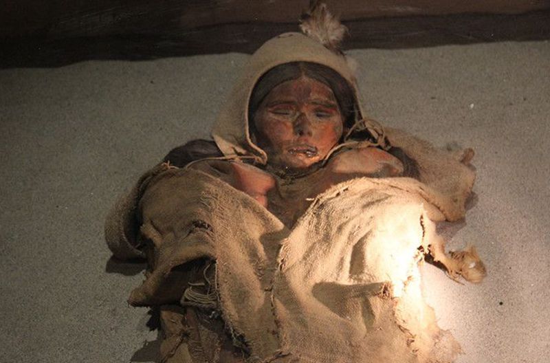 “楼兰美女”,1980年出土于新疆若羌县楼兰墓葬群。出土时身长152厘米(生前身高约155.8厘米),体重10.7公斤。生前年龄约40-45岁,是一壮年妇女。经中国社会科学院考古研究所C14测定,其年代距今3880±95年,是早期楼兰人遗体。比长沙马王堆女尸还要早1800多年。