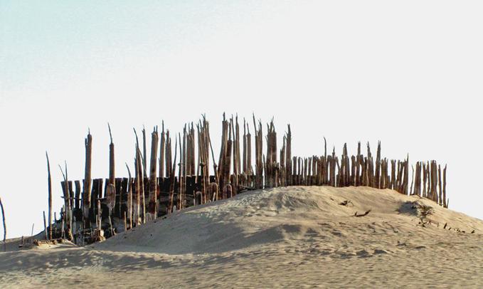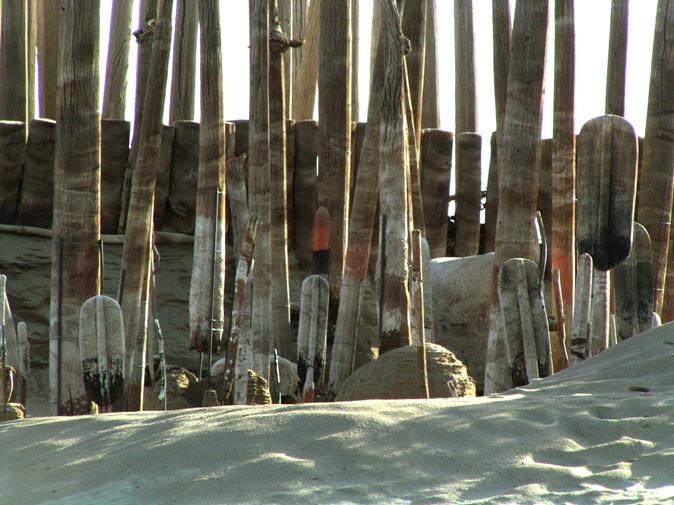 小河墓地给人留下的第一个强烈印象就是小河墓地的沙山上密密麻麻矗(chù)立的胡杨木柱。根据死者的性别不同而不同。女性棺前立的是基本呈多棱形的上粗下细的木柱,高度一般1.3-1.5米左右,上部涂红,缠绕毛绳、固定草束;男性棺前则立一外形似木桨的立木,大、小差别很大,大的高达2米、宽0.8米左右,其上涂黑,柄部涂红。多棱形的上粗下细的木柱可能象征男根,桨形立柱则象征女阴。它们组成了小河墓地神秘而惊世骇(hài)俗的生殖崇拜文化景观。人类早期文化中对生殖的崇拜在很多民族的遗存中都有发现,但像小河墓地这样极度的崇拜方式却举世罕见。