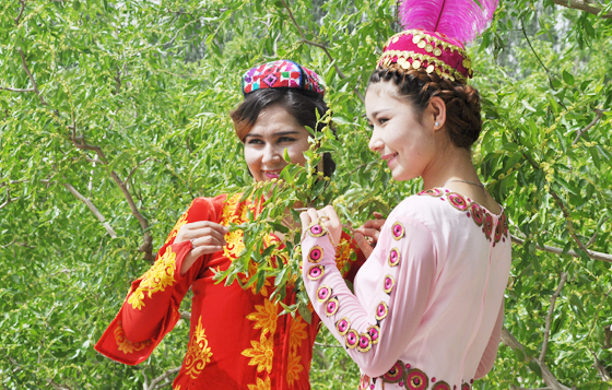 图为 身着节日盛装的维吾尔族姑娘在枣园拍照留念(记者 杨晓东 摄)