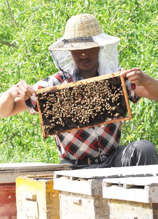 图为 蜂农展示放蜂、割蜜画面(记者 杨晓东 摄)
